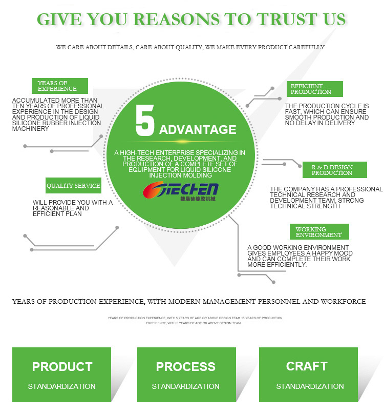 Dongguan Jiechen Silicone Rubber Machinery Co., Ltd. is a high-tech enterprise specializing in R & D and manufacturing of liquid silicone rubber injection molding machine. The company has a professional technical research and development team, strong technical strength and perfect after-sales system to provide strong technical and service guarantee for customers. The company has advanced equipment, perfect technology, strong technical force, accumulated more than ten years of professional liquid silicone rubber injection machinery design and production experience, obtained a number of invention patents, reached the leading technical level in the industry.